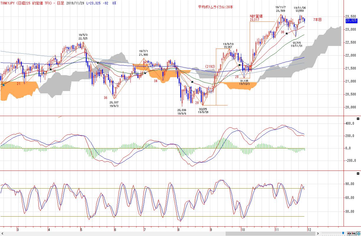 現水準は8月26日安値から10月3日安値までの1サイクルから算出した一目均衡表の値幅観測論N計算値(23317円)の水準となり、11月7日高値と11月26日高値のダブルトップを形成する途上にあることから下落リスクが徐々に高まりつつある。
