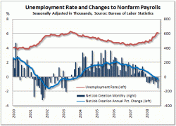 米労働省が3日発表した9月の雇用統計(季節調整済み)によると、非農業部門の雇用者数は15万9000人減少し、9カ月連続で悪化した。2003年3月の21万2000人減以来、5年半ぶりの大幅な落ち込みとなった。失業率(軍人を除く)は前月と同じ6.1%だった。金融危機は実体経済に波及し、雇用にも悪影響が及び始めている。