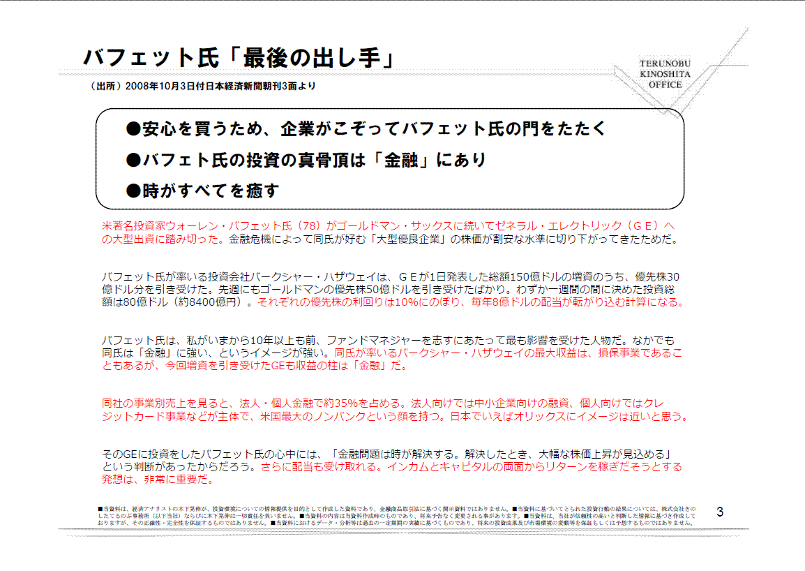 そのGEに投資をしたバフェット氏の心中には、「金融問題は時が解決する。