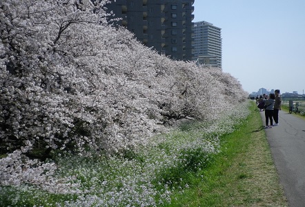 ↑下丸子付近。下流の多摩川大橋にかけて桜がずっと続いています。