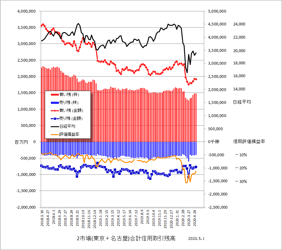 で、たまにはブログでもということで、5/1現在の信用取引残高のグラフです。