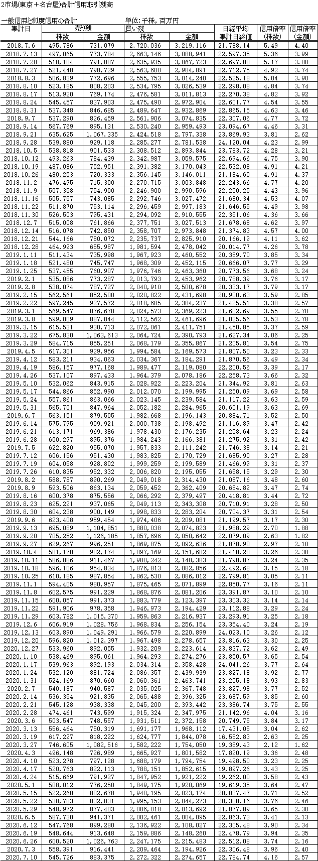 信用取引残高のグラフ(R2.7.16現在)
