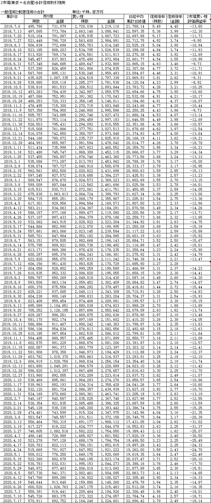 で、7/17現在の信用取引残高のグラフです。買い残がかなり減って売り残が増えています。