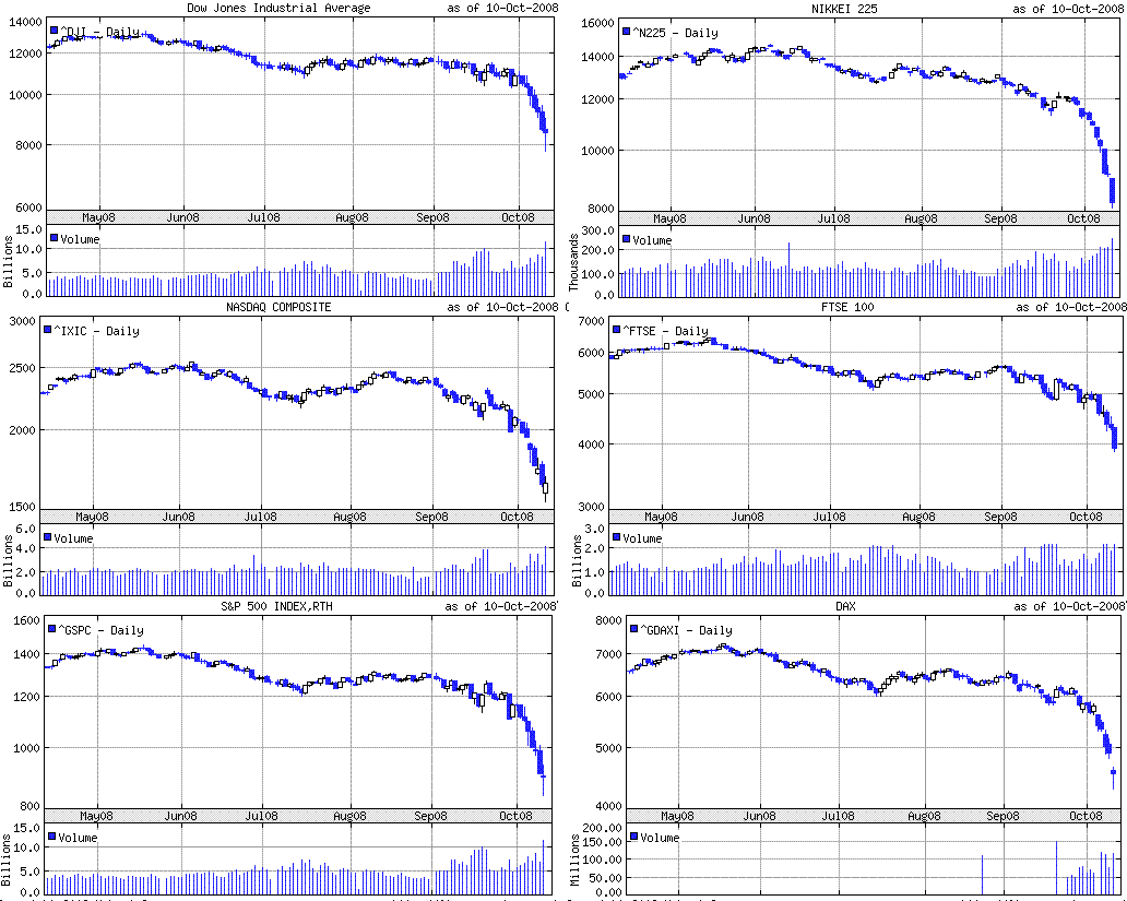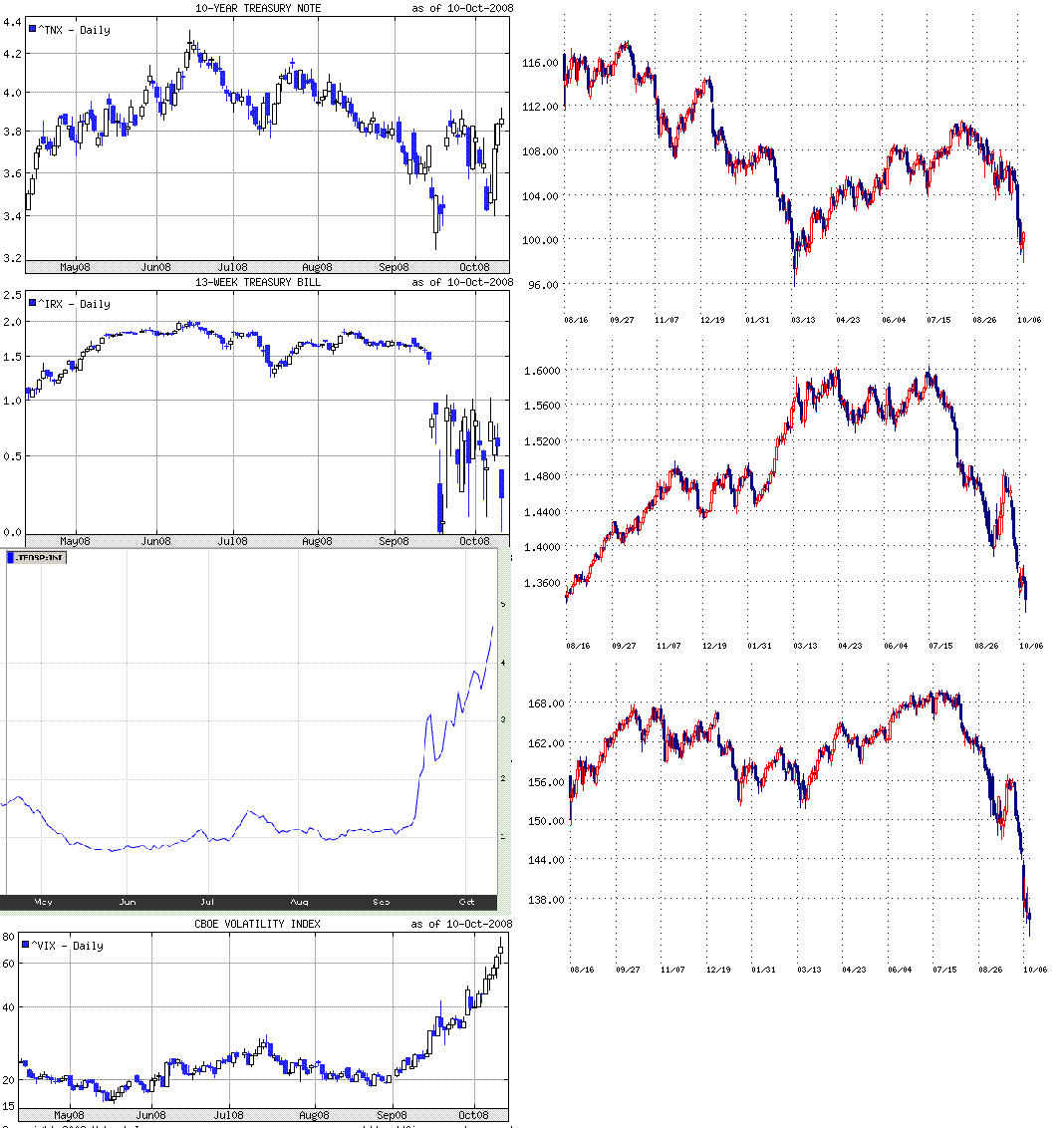 週間では、ダウは-18.2%、ナスダック指数は-15.3%、S&P500は-18.2%の大幅下落でした。一週間を通じてダウは下がり続け、週間の下落率は指数算出以来、最悪の数字となりました。約一年前につけた高値からのダウの下落率は40.3%に達しています。戦後のベアマーケットの平均下落率が30%台前半なので、長期で見ても今回のベアマーケットはかなり強烈な部類に入ります。株式市場は、ITバブルやブラックマンデーの時のような異常な水準まで買われていたわけではないのに、ここまで下がるのはすごいですね。それだけ株式市場以外の金融市場、おもに証券化商品やデリバティブ商品のバブルがひどかったのでしょう。VIX指数の過去のピークは40台でしたが、先週今週はそれを大幅に更新し、金曜日には76.94まで達しました。
