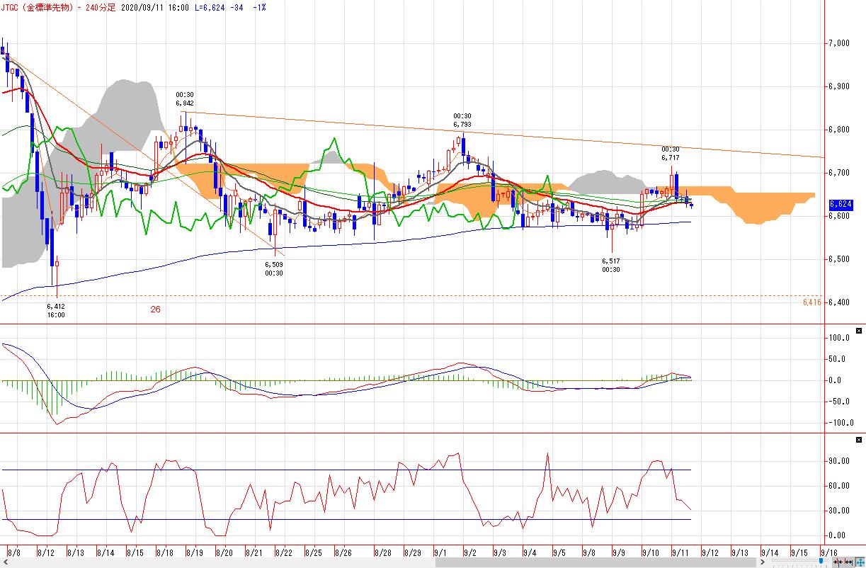 実線は一時6717円まで上昇する場面もありましたが、その後は戻り売り優勢の展開となり、長い上ヒゲ陰線を形成中です。