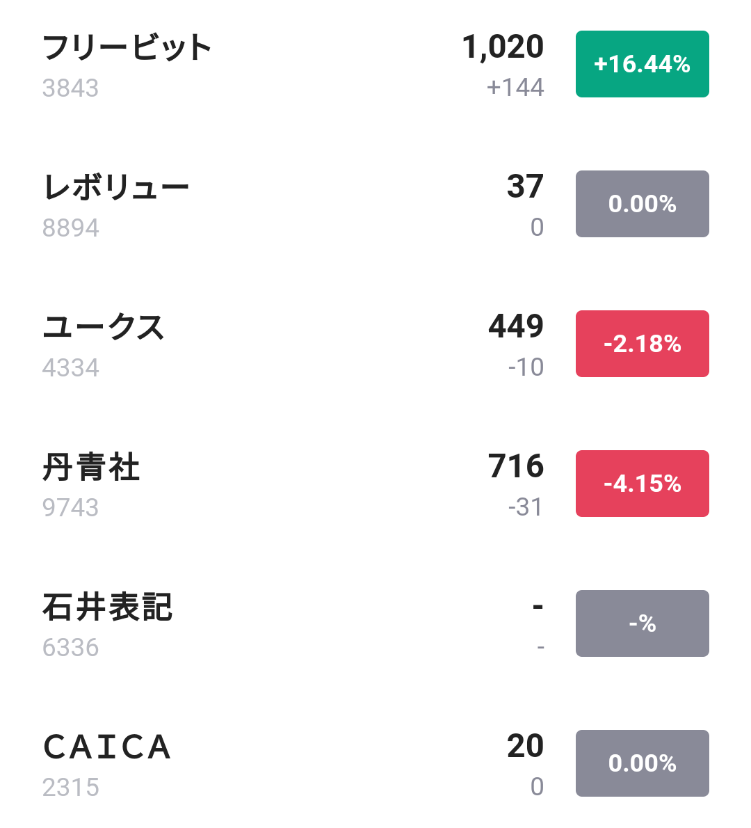 先週予想したフリービット、石井表記いいですねー。石井表記ストップ高あげみざわー。丹青社、ユークスさげちゃいましたー笑。ほかは動いてないですねー