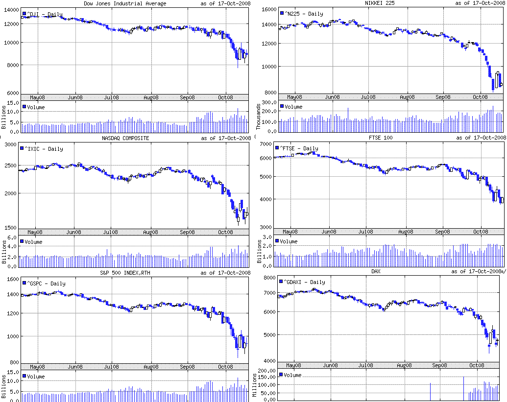 週間では、ダウは+4.75%、ナスダック指数は+3.75%、S&P500は+4.6%でした。先週の20%近い下落から反発はしましたが、戻りは鈍かったです。日々の動きは相変わらずボラティリティの高い状況が続きました。月曜日は、欧米各国政府が金融危機へ迅速な対応をし始めたのを好感し、ダウは+936ドルと史上最大の上昇幅を記録。火曜日は、-76ドルと小幅安。水曜日は悪い経済指標を嫌気し-733ドル、木曜日は理由はよくわかりませんが+401ドル、金曜日は-127ドル。引け値では小幅な動きの日も日中では数%上下することがザラでした。VIX指数も高値を更新し、80超えを記録しました。
