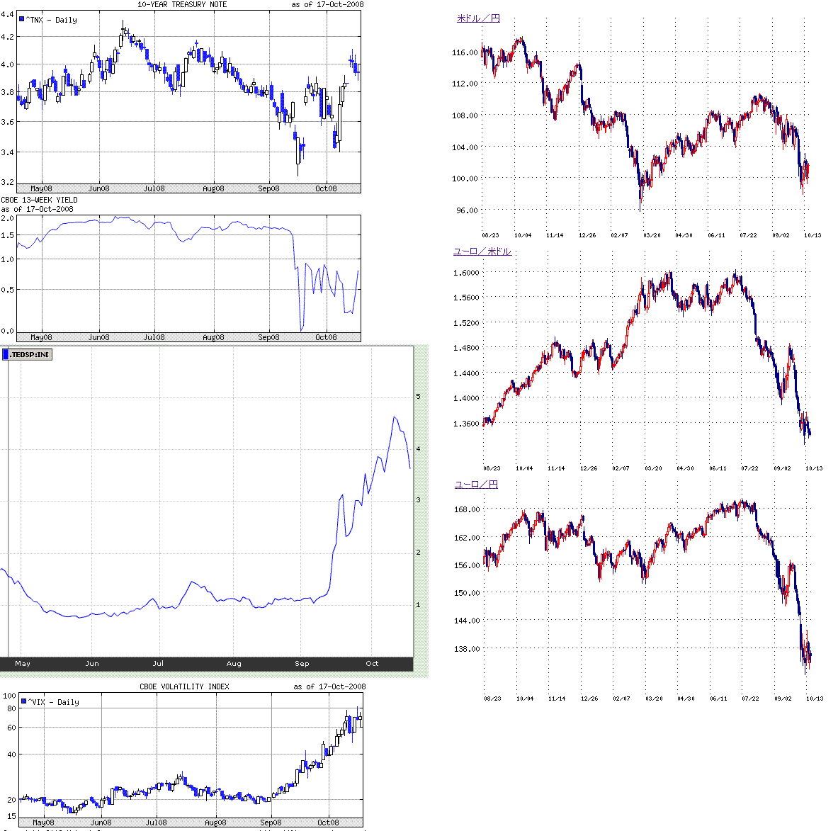 木曜、金曜に、経済指標の割に株式市場が売られなかったのは、凍りついていた短期金融市場、クレジット市場が解け始めたのも一因かもしれません。高止まりしていたTEDスプレッドは下がり始めています。各国の金融危機対策が効いてきているのだと思います。