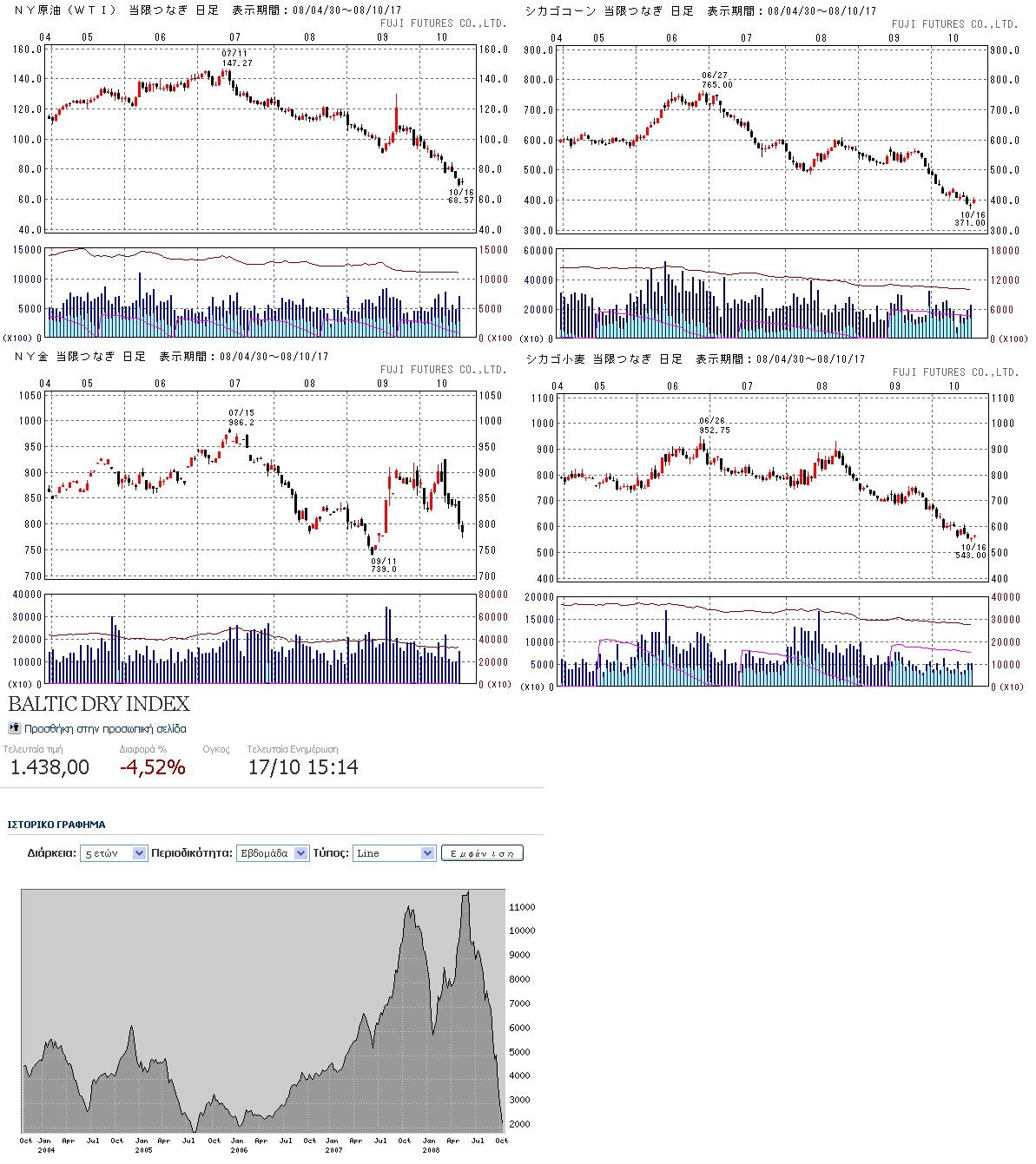 全体的に下落。原油価格(WTI)は70ドル割れ。商品市場も結構な暴落をしています。景気が悪くなれば工業用コモディティの需要は落ちますからね。ついでに、バルチック指数も下げ止まりません。ドライバルク船は、鉄鉱石、石炭、穀物などを運ぶ船で、これらの荷動きが急激に落ちているということは・・・資源メジャー、特に鉄鉱石価格に強気だったところは来年ひどいことになりそうです。ゴールドは下落。信用不安が収まってきたのを表しているのかもしれません。