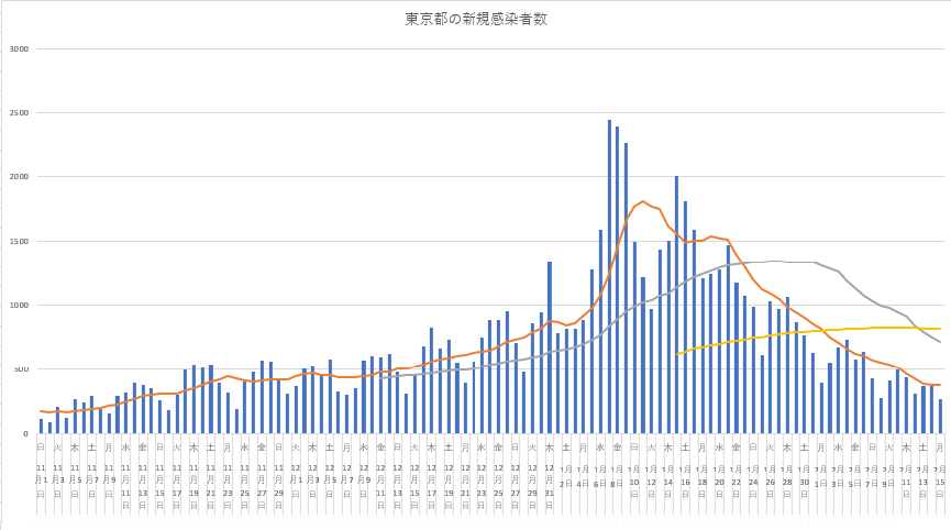 新規感染が7日移動平均のちょい下にあるのはぎりぎりセーフな感じか。11月のはじめごろに近くなっていて、超長期平均線はよこよこに。
