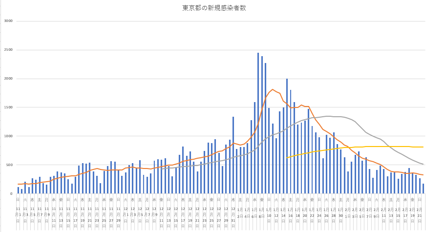 まずは東京都のデータから。日本データの本日分は明日更新予定です。グラフには昨年の11月1日分から表示させていますが、そのころに近くなってきたでしょうか。土日月の下げカーブはいつも急なので、明日からまた様子見ですね。月末までに3月の判断をできるでしょうか。