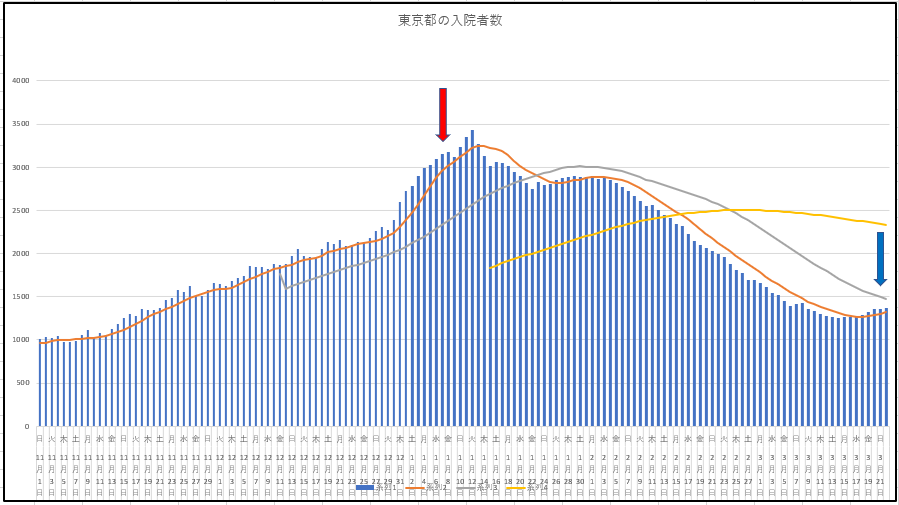 東京都の新規感染と入院患者数。青い矢印がまさに解除の位置。月曜に新規が少ないのは普通ですが、平均線の動きは微妙ですね。それに入院患者って微増している風。