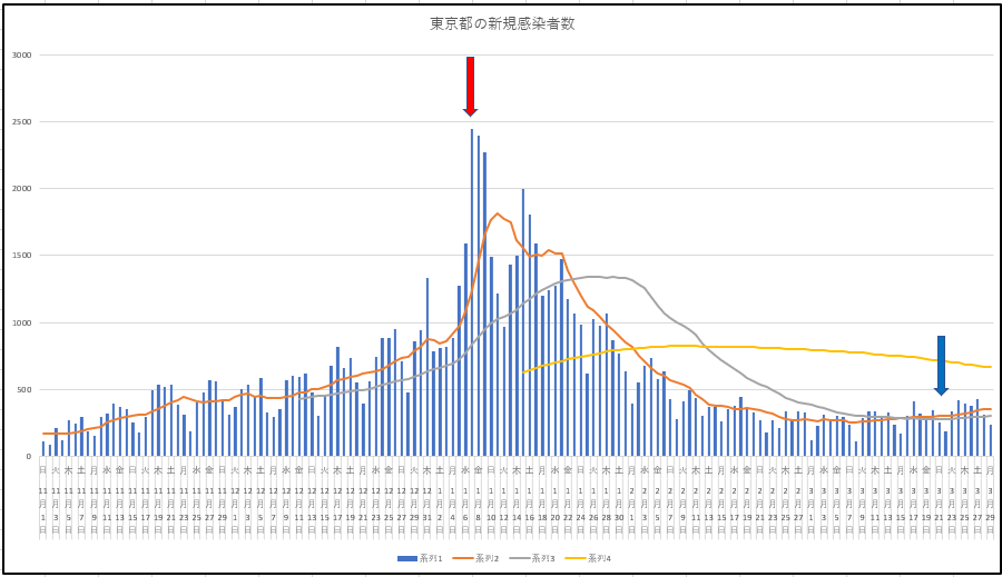 月曜は月曜なりのデータ。トレンドみたら明確に上昇ですねん。もっと強く断言して(とくに緊急事態とかじゃなくてもよいので)緩みがちな人々に対して注意喚起を続けるべきでしょうね。