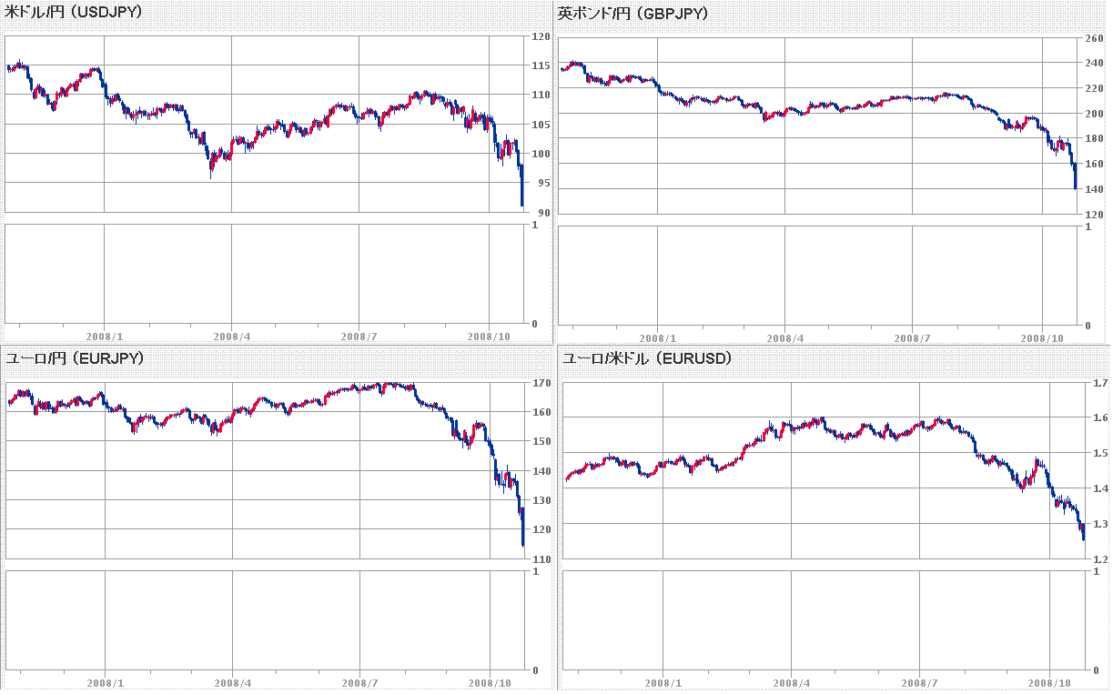 夕方の段階でさらに円高が進行し、日経平均先物も夕場取引でさらに暴落しています。金融不安、新興国通貨危機、大恐慌・・・マーケットはパニック状態になっていますね。今の円高は行き過ぎな気がしますが・・・商いが薄い中をガツガツ仕掛けられている感じがします。ドル円、豪ドル円、ボンド円は過去10年での最安値水準です。