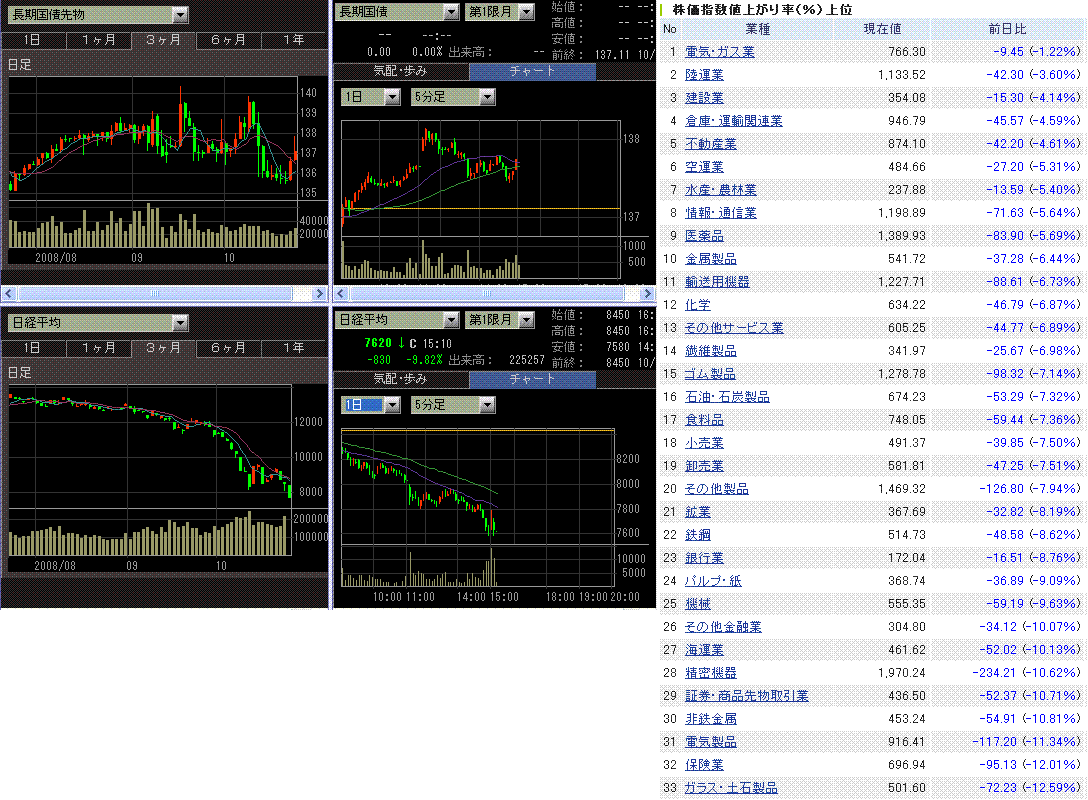 急激な円高進行とアジア株安を受けて、日経平均は暴落。今日の日経平均の下落率は-9.6%で歴代5位となりました。S安張りつきの銘柄が多くあったので、日経平均は2003年3月の安値である7603円は実質的には下回っていたと思われます。ザラバの先物安値は7580円でした。