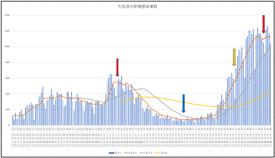 東京都と大阪府の新規感染者数の推移。そろそろ緊急事態宣言の効果か?吞んで騒ぐ人がばたばた倒れてたら分かり易いのだけど、症状がなかなかでないし、自粛しても効果がでるまでこれまた日数がかかるのがこの感染症の厄介なところですね。