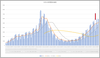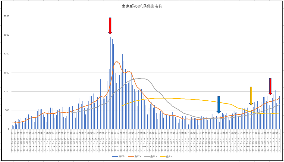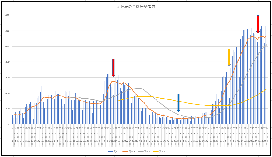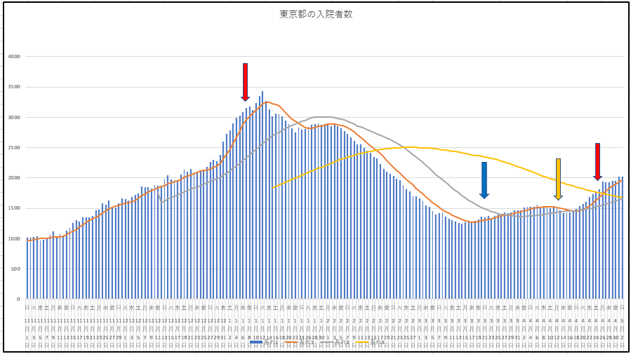東京都の新規と入院数の推移。大阪府の新規。大阪の入院のグラフがないのは残前だが、東京都の1月の緊急事態からの収束と入院患者の変化、および今回の入院患者の状況からは、大阪もがんばれば収束するかも・・・・