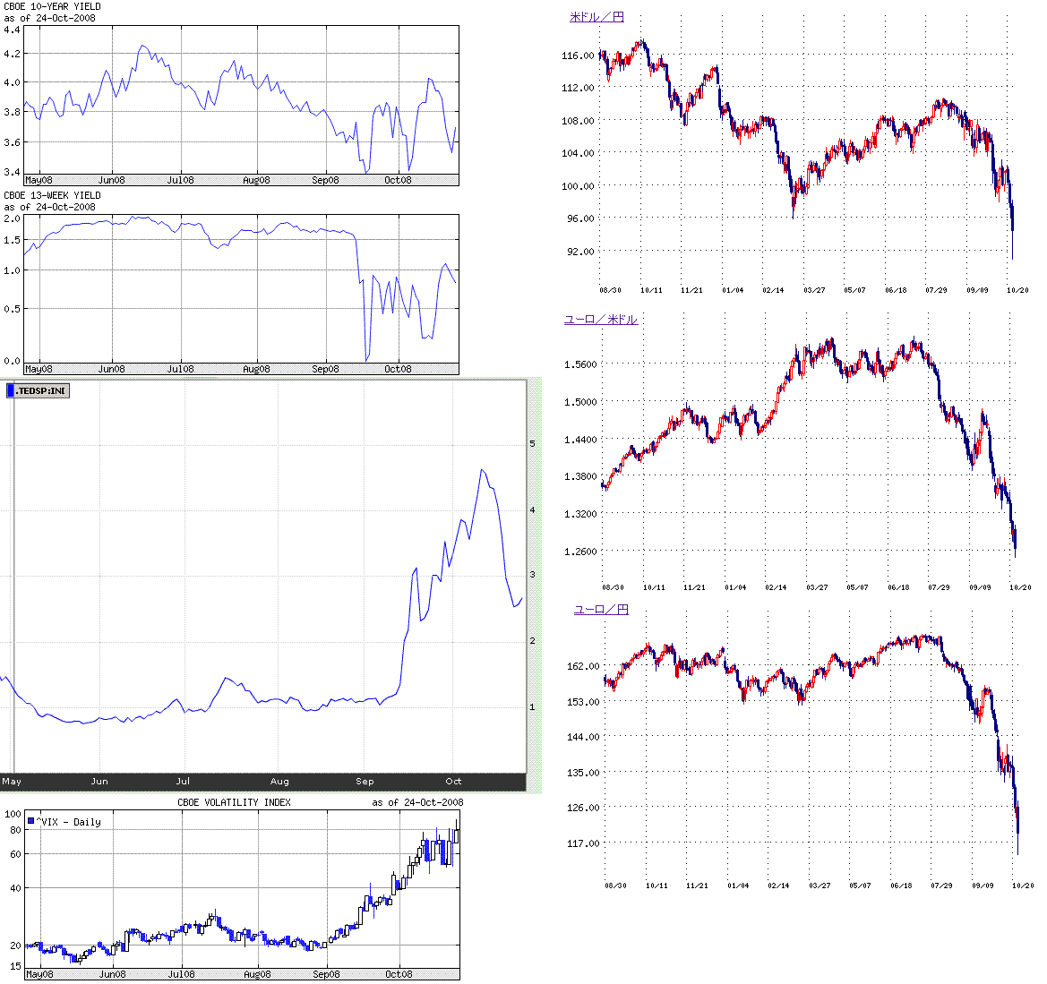 アイスランドの実質破綻に続いて、パキスタンがデフォルト危機になったり、アルゼンチンが年金国有化を目指したり、ウクライナやハンガリーが支援を求めたりと、新興国や経済規模の小さな国で危機的状況に陥る国が続出しています。これらの国の通貨も猛烈に売られています。ハンガリー、デンマークは通貨防衛のために利上げを行いました。通貨が売られれば、外貨建ての債務が膨らむし、国の信用自体が下がっているので借り換え金利も高くなります。スパイラル的に国家財政が厳しくなります。