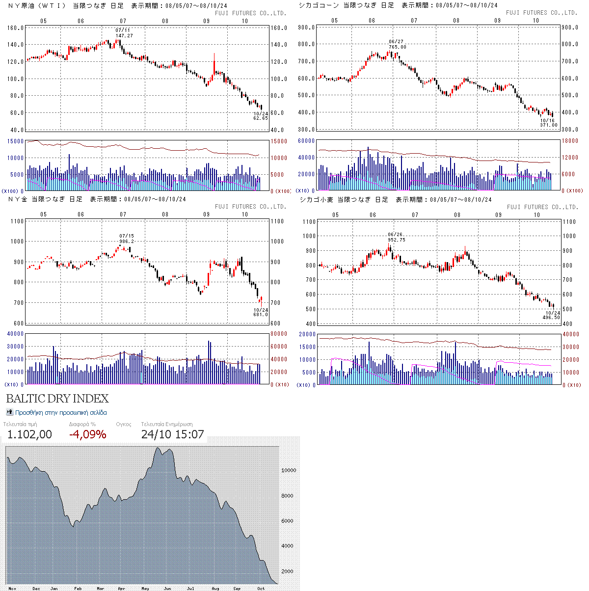 ゴールドが大きく下落。信用不安が収まってきたのと、実体経済悪化で実需(主に宝飾品用)が落ちると思われているのでしょうか。原油価格も、OPECの減産発表にもかかわらず下落。景気が悪ければ原油需要も落ちる。価格の動きを後付けで説明するとこんな感じになりますが、コモディティファンドの解約売りなどの影響が大きそうな気もしますね。
