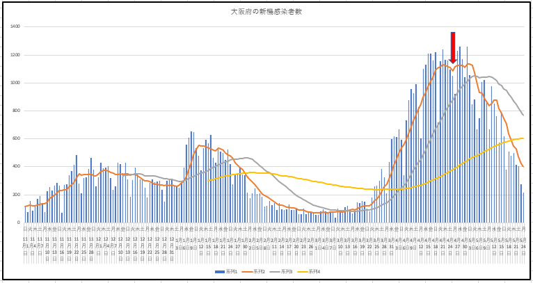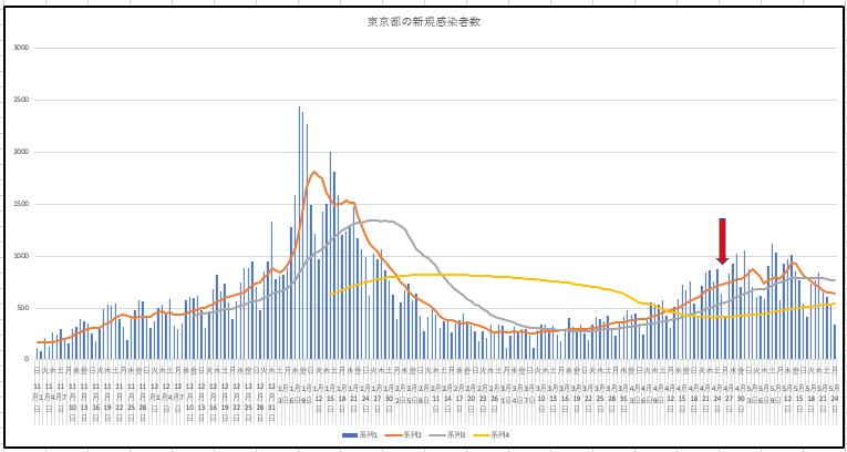 東京都の新規の平均線が下向きからやや横に。大阪は完全に下向き。もうウオッチしなくてよいかな(^^)?