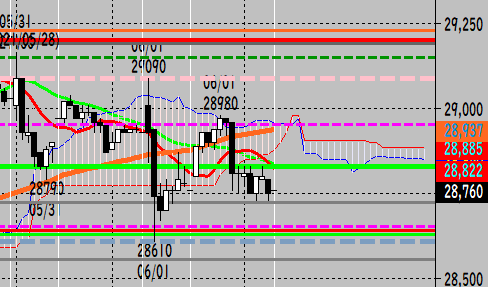 ナイトセッションでは四回28830(週足25MA)で売られているので、一旦は28610を試す展開か