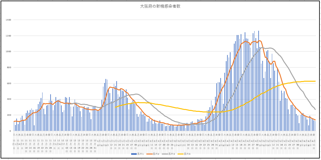 日本全国の新規と患者数の推移。こちらも同様な傾向に。