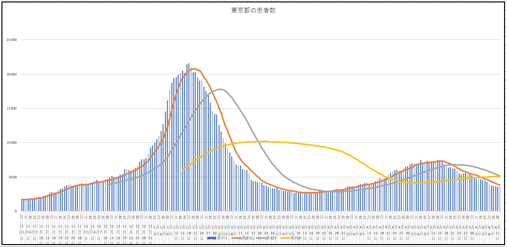 とくに東京都は新規に続いて患者数も、28日移動平均が