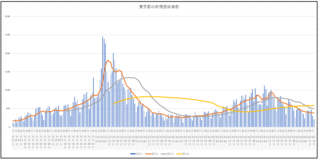 新型コロナの感染がさすがの月曜でかなり減ったので載せておきましょう。14日までの東京都の新規と患者数推移。