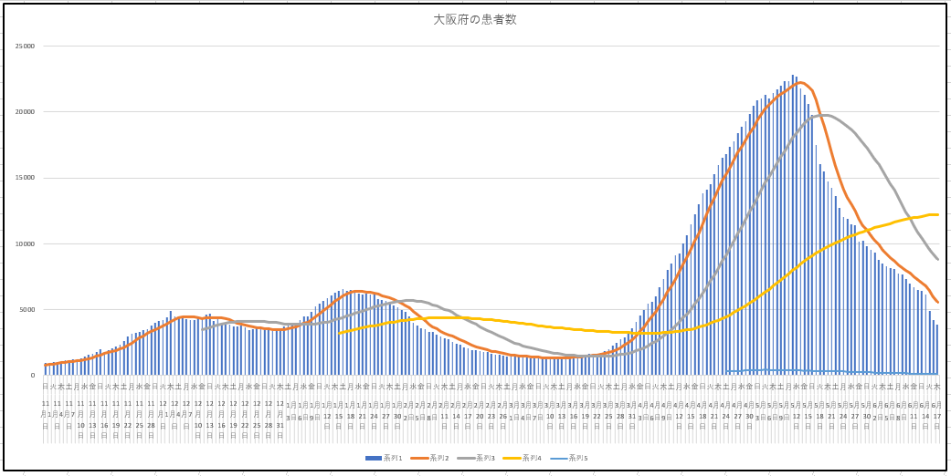 東京都の新規数は7日移動平均線の上に出て、次に降りて