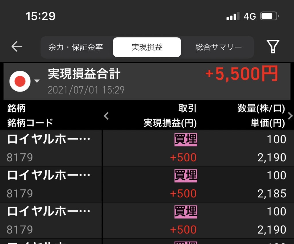 空売り、7/1の実現損益は+5500円