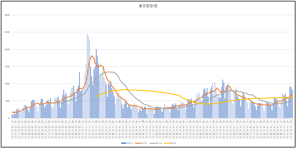 まずは東京都の新規感染の推移。7日移動平均、28日移動平均は上昇していましたが、とうとう84日(12週)移動平均線まで若干ながら上昇を始めました。