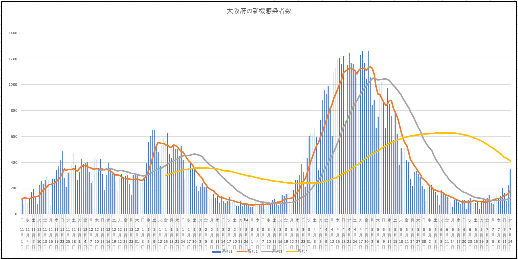 ひさしぶりに大阪府の新規と現存患者数の推移グラフ。上昇に転じています。東京と同様に重症や死者は減っていますが・・・阪神首位が原因とか?