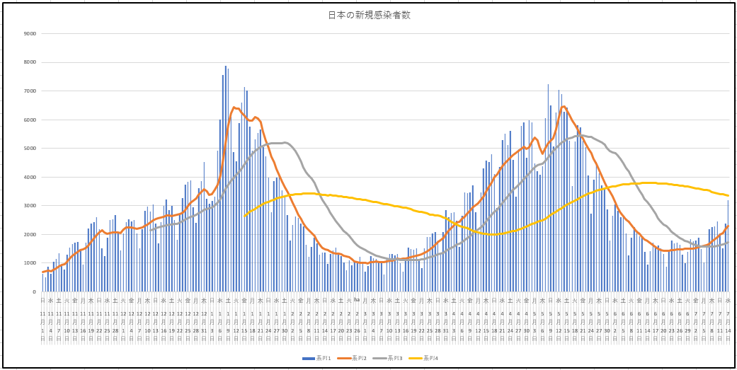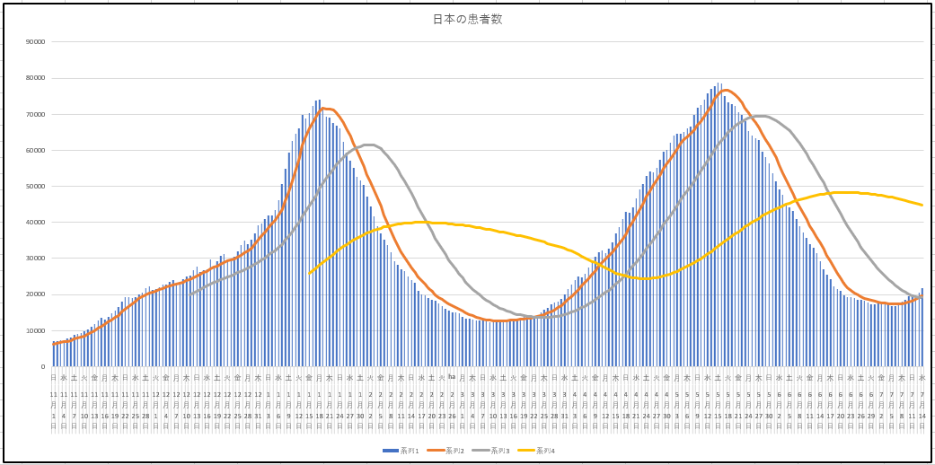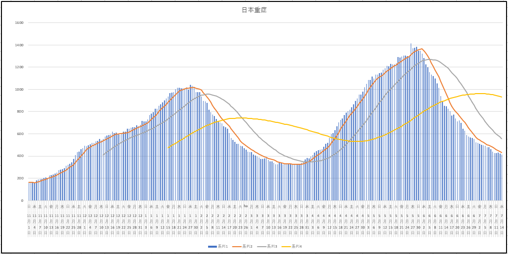 日本全国の新規、現存患者数、重症者。縦軸は自動調整なのでサイズが異なります。