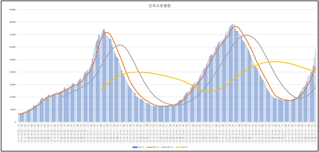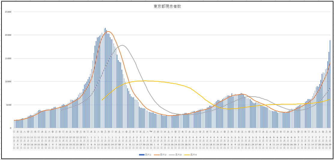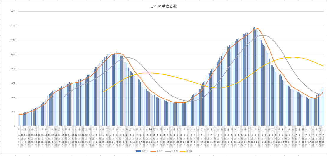 同じく29日までの日本全国の新規、現存患者数、重症者数の推移。東京都似てきた、という表現が正しいのかどうか?
