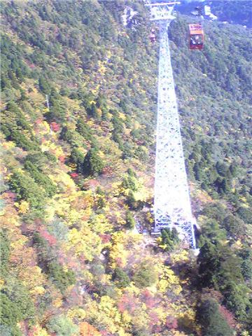 伊勢湾岸道の橋のひとつです、ここは名港トリトンといって3っの綺麗な大橋がかかり綺麗です、特に夜景はすごいです。御在所山のロープウエーから見た紅葉です。頂上はもう終わりです。下の竹細工は霧氷が綺麗にできるように作られているようです。国道が大水で流されて大変だったみたいです。まだ不通のとこが多いです。道路はすごく混んでいました。紅葉を見ながら待っていました。