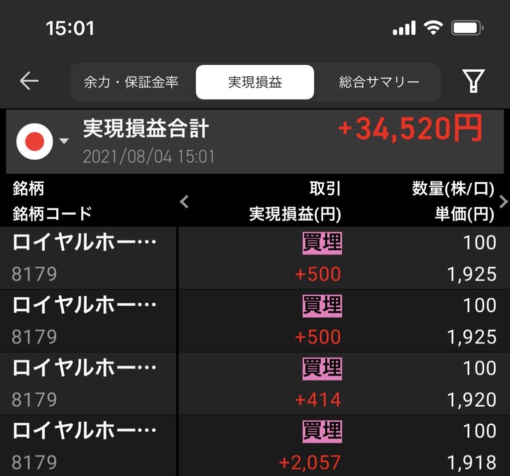 空売り、8/4の実現損益は+34520円