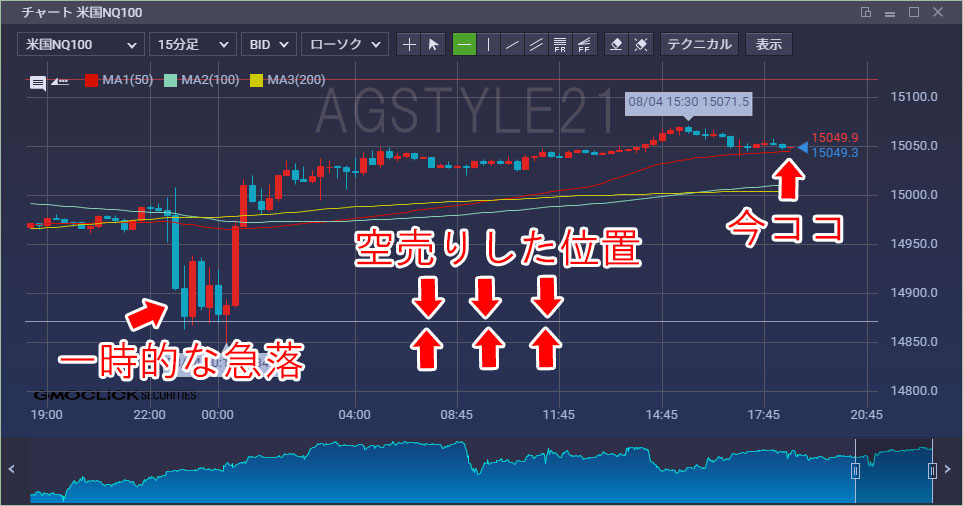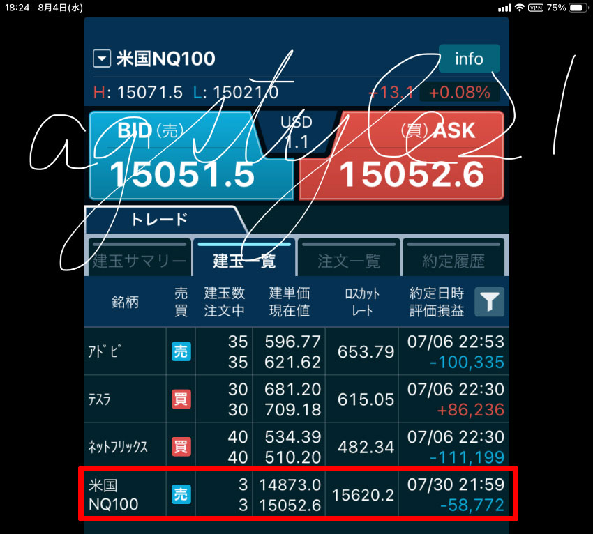 これからいよいよ下落トレンドの始まりなのでじっくり利益を増やしていこうと思っていましたが、就寝時間までにプラスに転じることはなく、翌日以降に凄い期待をしていましたがブログを書いている今現在(8月4日18:24)