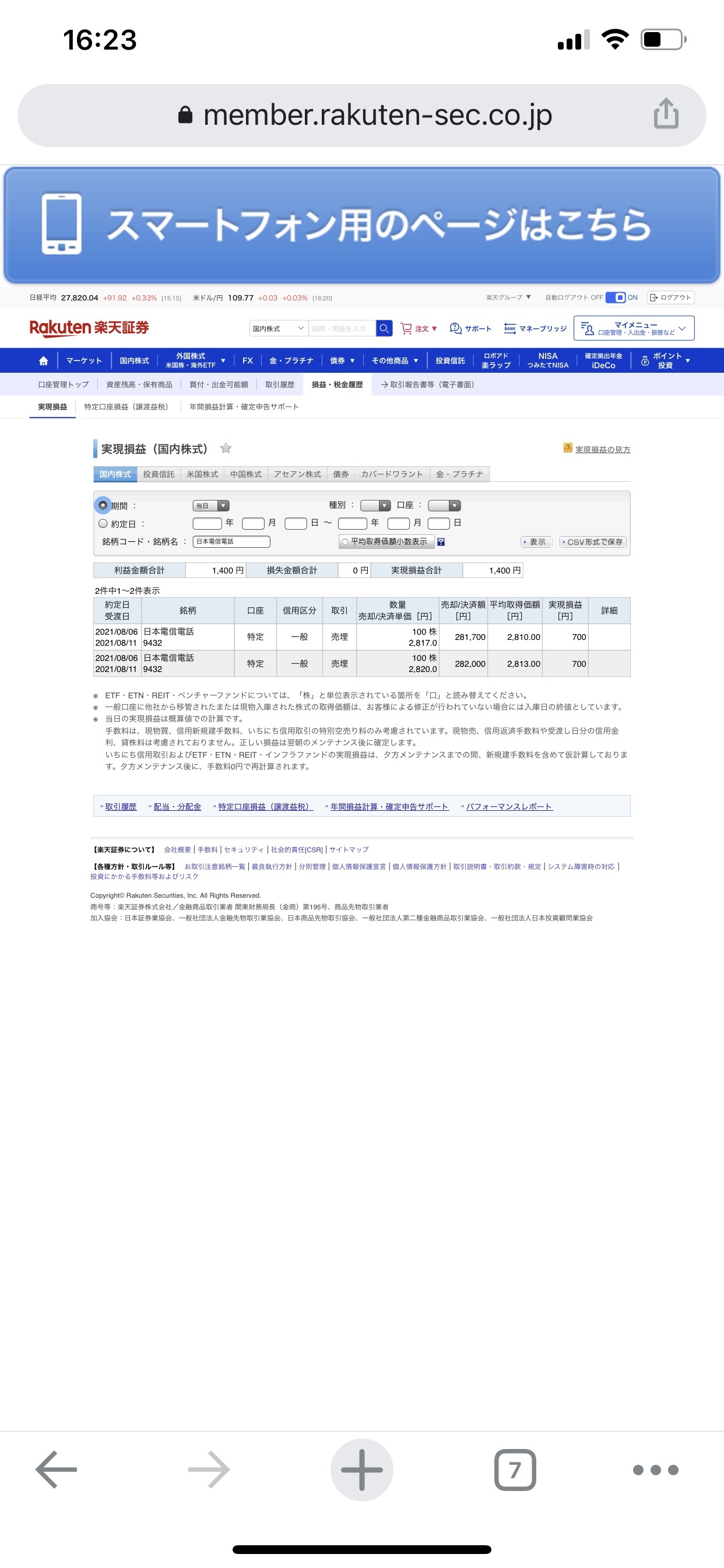 日本電信電話(9432)8/6の実現損益は+1400円