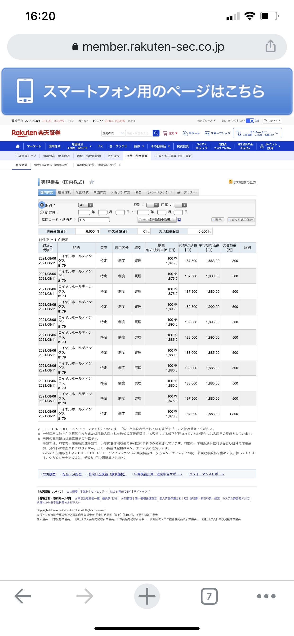 ロイヤルホールディングス(8179)8/6の実現損益は+6600円