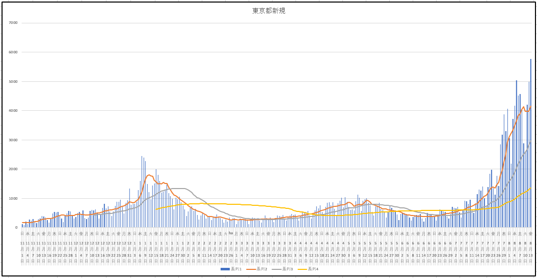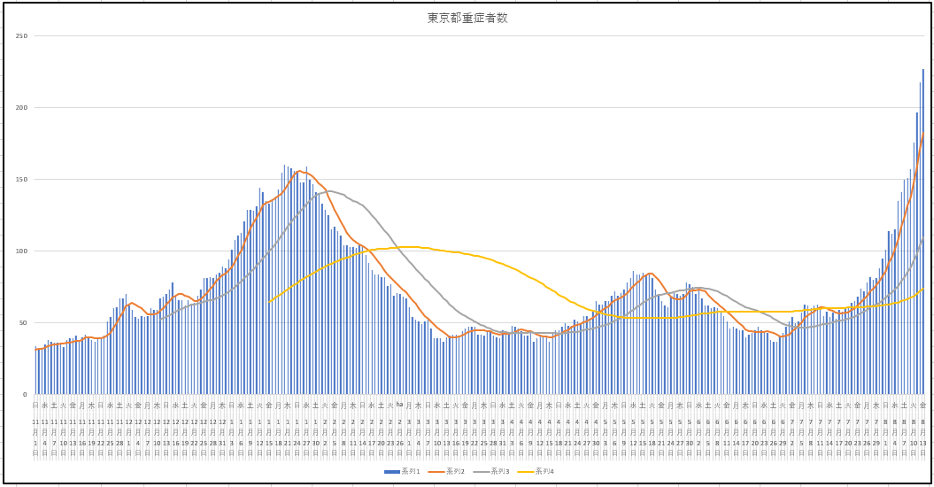それはさておき、東京都の本日までの新規感染者数と重症者数の推移。無症状や軽症者が多いといっても、危なくなる人もいるんで、このままじゃまずいと思うのだけど。