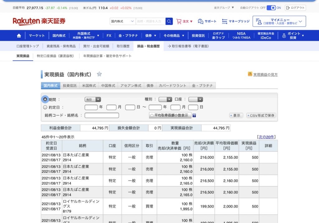 日本たばこ産業(2914)8/13の実現損益は+2000円