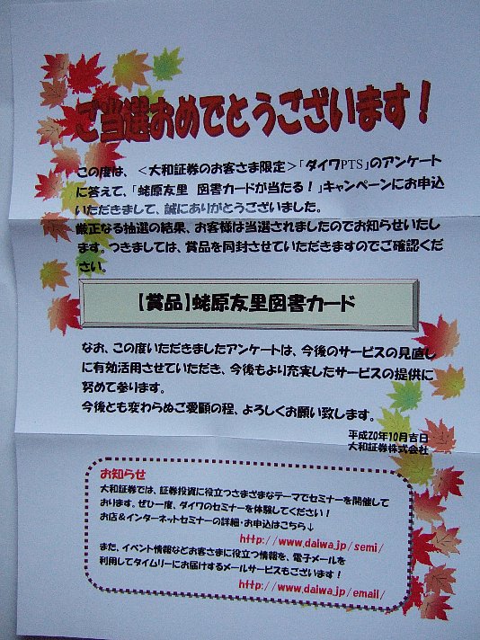 大和証券で株取引しないからかなぁ~ うぅ~。。