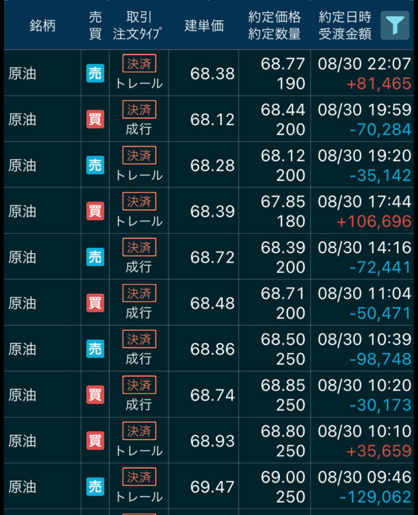 ここ最近のマイナスを取り返すべく、またここ2日は勝っているので調子に乗って、また高橋ダン氏の動画で「原油は騰がる!」と言っているので一発行ってみることにした。