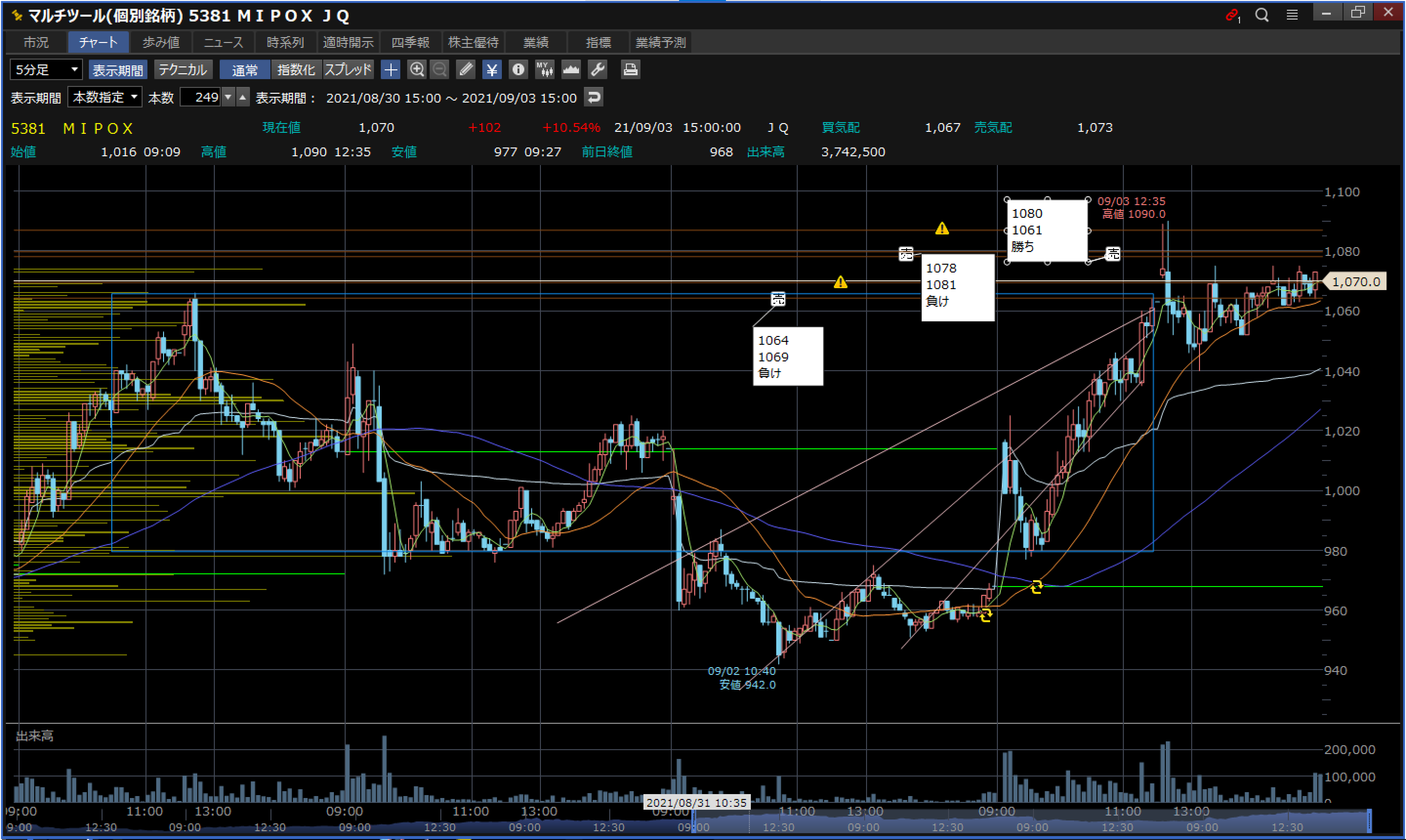 当日:100円急騰、BOX天井上髭、解放E(徐々上がりで警戒)