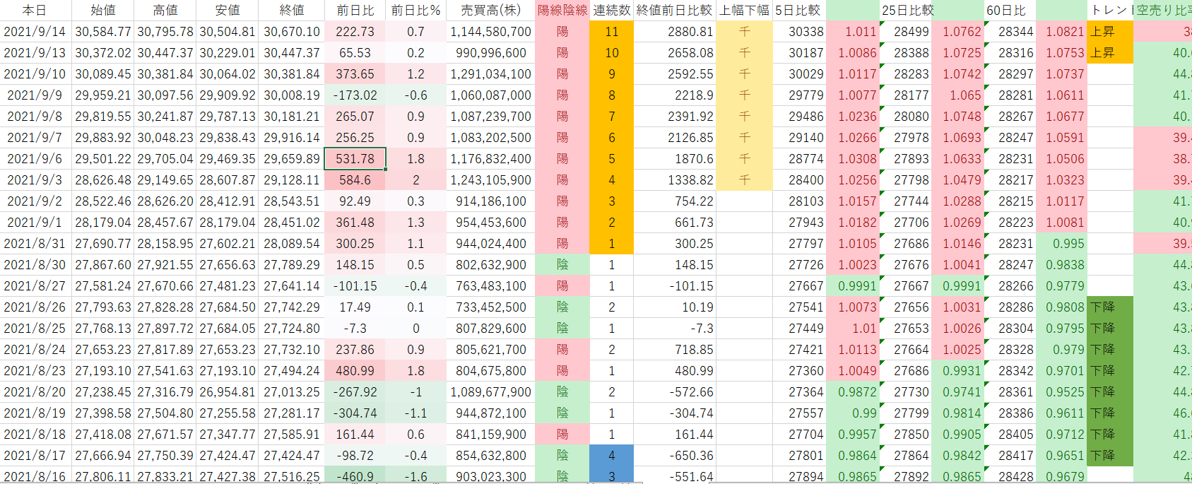 日経平均の統計市場初11日連続陽線となりました!!!!!