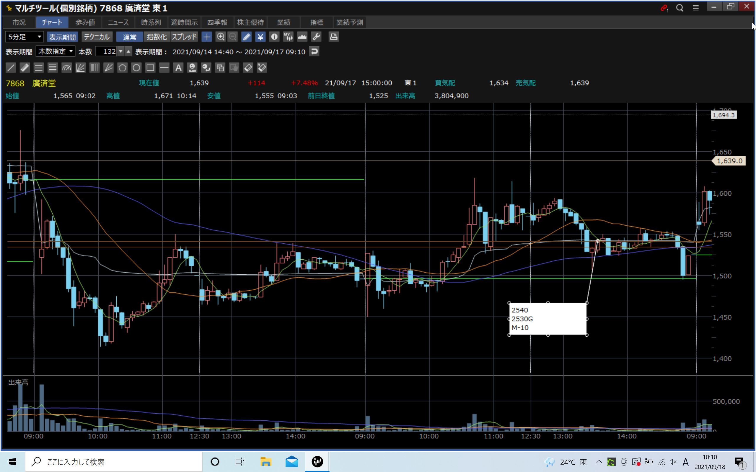 当日:場中、5分足アンダー、長い下髭でエントリー〇