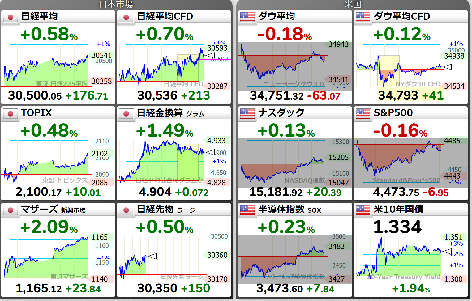 NYダウ 34751.32 -63.07 ( 9月16日) 米国10年国債利回り 1.334 %