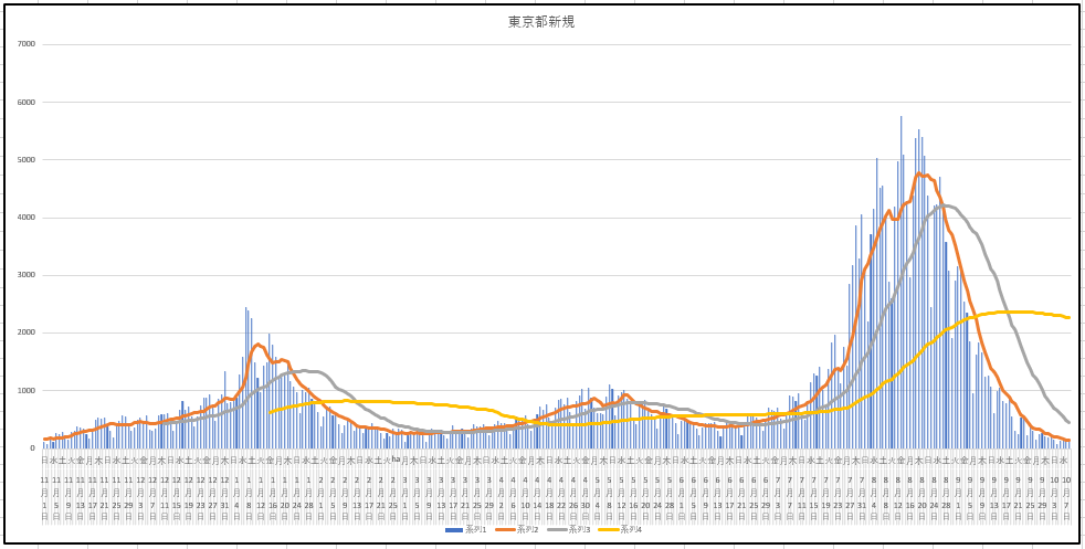 ひさしぶりに東京都の新規感染、入院者数、重症者数の推移を