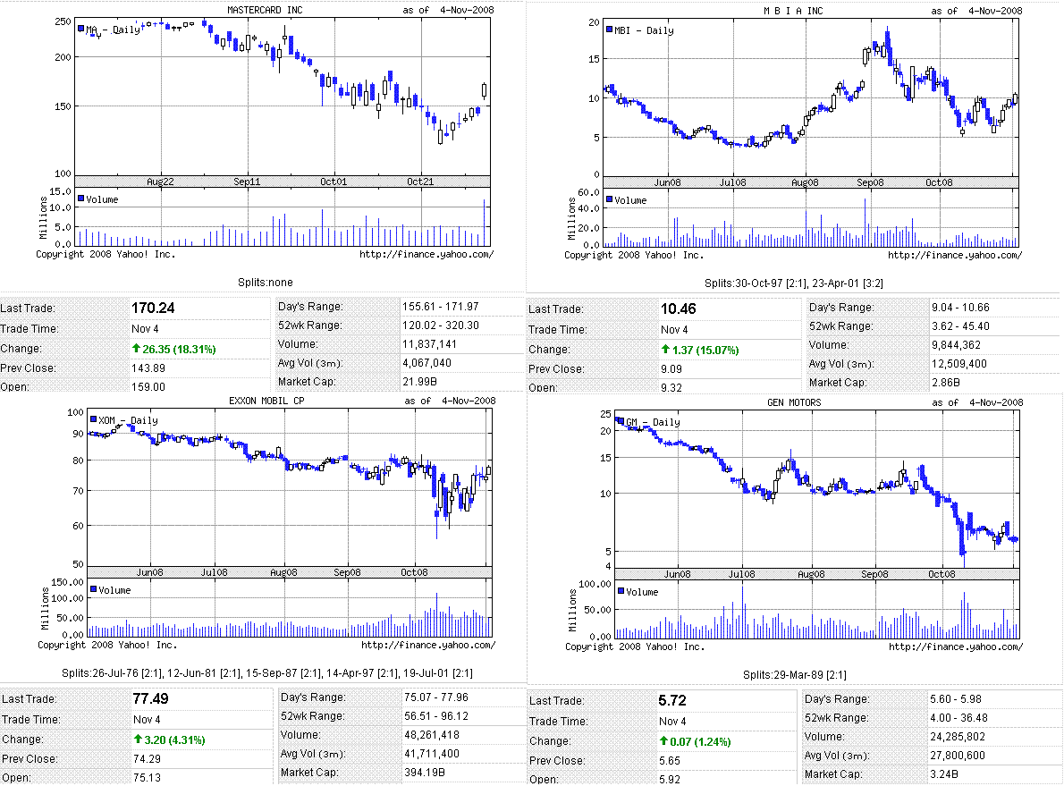 米株は大幅続伸。原油高により資源関連銘柄が買われました。銀行以外の金融機関にも政府が公的資金の注入を検討しているとの報道により、モノラインや保険株が買われ、銀行株も全体的に高かったです。新大統領誕生のご祝儀相場や、年末ラリーへの期待という面もあったようです。金融不安関連のニュースもいったん途絶えたし、経済指標がどんなに悪くても下がらないなら、買うしかないって感じになっていますね。