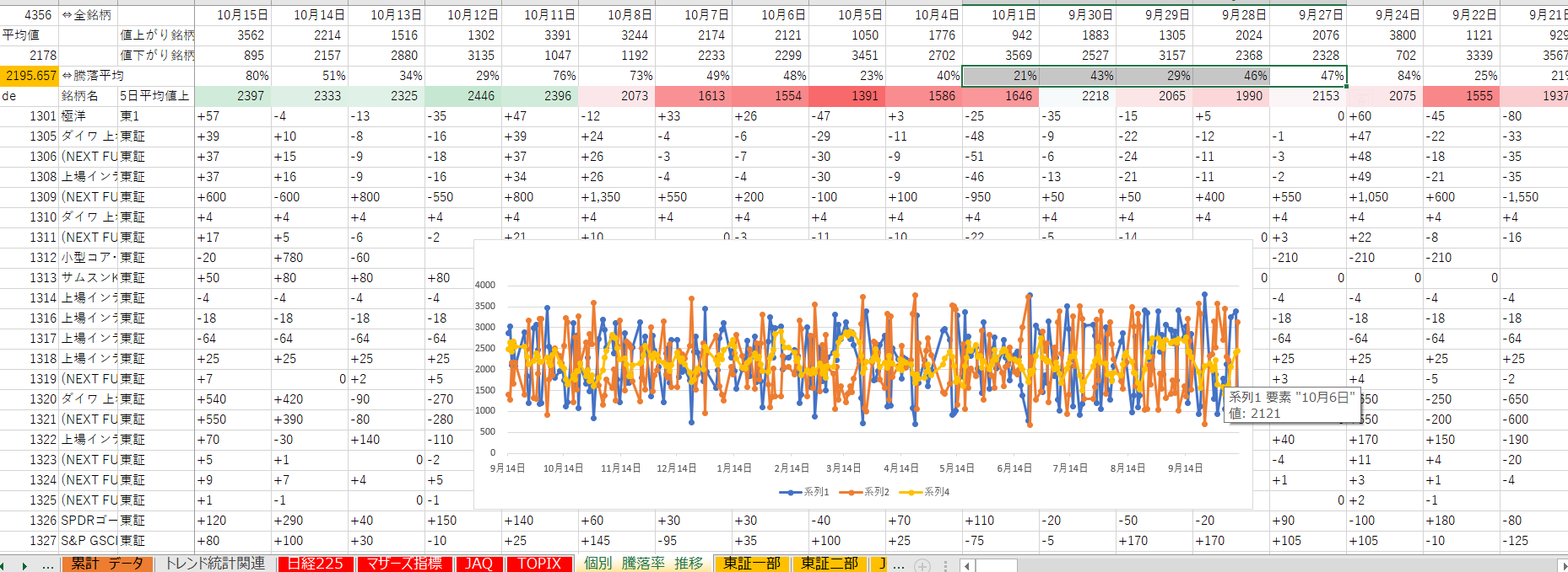 写真1枚目上の色がついているものが値上がり銘柄数を表します。